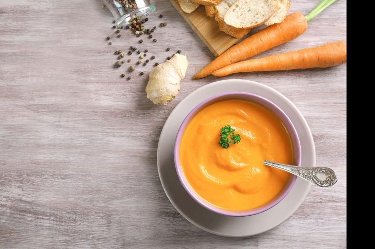 In einem Suppentopf etwas Olivenöl erhitzen und die Zwiebelstücke gemeinsam mit dem Knoblauch glasig an dünsten. Mit Gemüsesuppe ablöschen und die Karotten hinzugeben. Mit Salz, Pfeffer und dem fein geriebenen Ingwer würzen.