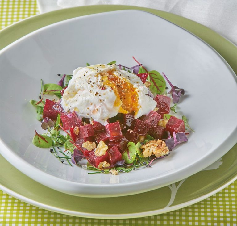 Rote Rüben waschen und mitsamt ihrer Schale in Salzwasser kochen, abschrecken, schälen und in Würfel oder Scheiben schneiden. Mit Limettensaft, Salz, Pfeffer und Olivenöl marinieren. Die gehackten Walnüsse darüberstreuen. Für das pochierte Ei Salzwasser auf circa 90 Grad Celsius erhitzen, mit einem Kochlöffel einen Strudel im Topf erzeugen, das aufgeschlagene Ei langsam hineinfließen lassen und vier Minuten ziehen lassen. Das Ei mit einem Schaumlöffel aus dem Wasser holen und dekorativ auf dem Salat anrichten.