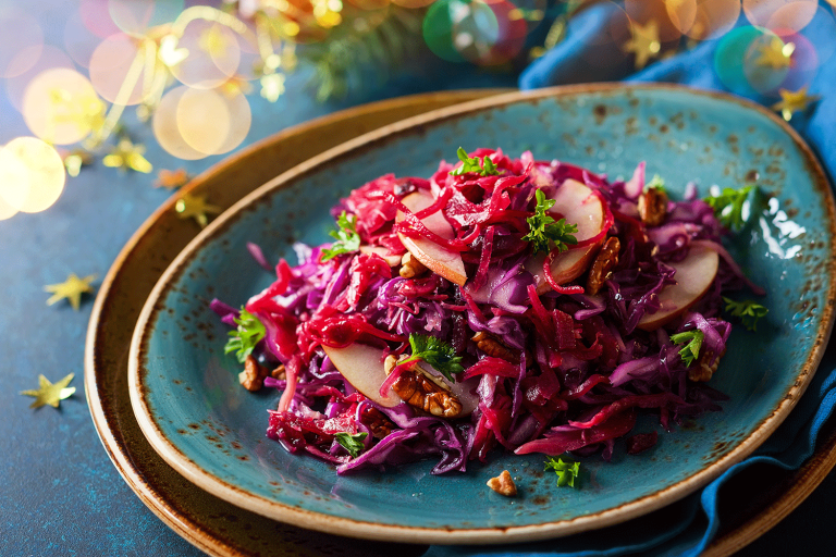 Rotkraut hat in den Wintermonaten Saison und kann für verschiedenste leichte und herzhafte Gerichte verwendet werden. Das kalorienarme Gemüse birgt jede Menge Eisen, Mineralstoffe und Anthocyane, die entzündungshemmend und immunstärkend wirken. Außerdem enthält die Kohlart viel Vitamin C.