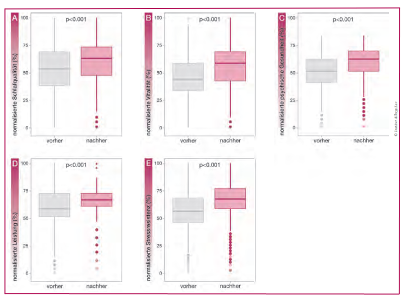 In un altro studio, quasi 10.000 partecipanti, esposti a stress durante la pandemia COVID-19, hanno assunto un probiotico multispecie per quindici giorni, evidenziando miglioramenti significativi nella qualità del sonno, nella vitalità, nella salute mentale, nelle prestazioni e nella resistenza allo stress (vedi immagine).